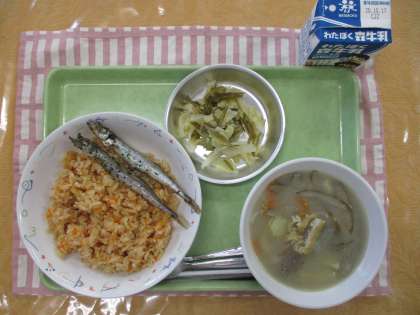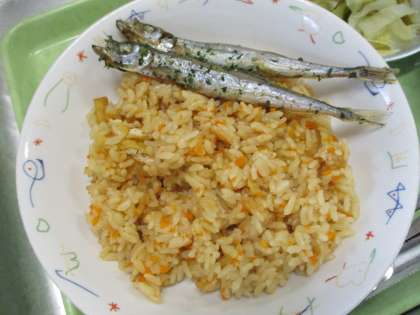 ビタミンAには疲れた目を回復したり、乾燥を防いでくれる効果があります。にんじんやかぼちゃ、ほうれんそうなど色の濃い野菜に多く含まれています。今日はたっぷりのにんじんをすりおろし、油揚げと一緒にごはんを炊きました。オレンジ色がとても鮮やかで、ししゃもの磯辺焼きの緑色とのコントラストがきれいでした。