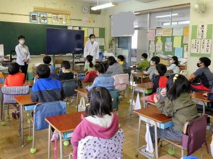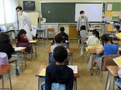歯科校医の先生がいらしてくださり、1年生と4年生にブラッシング指導を行っていただきました。今年度は感染症対策で染め出しは行いません。ビデオや夏休みのカードを見ながら、学習しました。授業の最後には、今夜からしっかり時間をかけて磨くことを約束しました。一生使う歯ですので、毎日磨いて、歯を大切にする心も一緒に育てていきたいと思います。