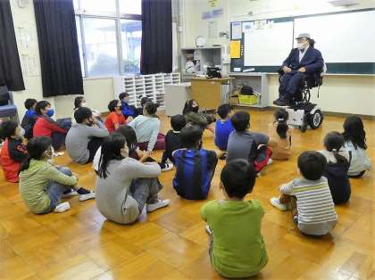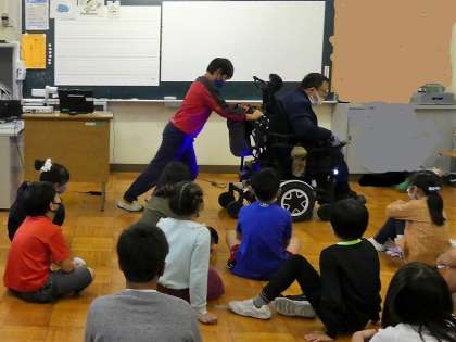 電動の車いすはかなりのスピードが出るそうです。いかに安全に(自分だけではなくて、周りの方にも) 動かすかも考えていらっしゃるそうです。相手への心遣いが広がっていけば,社会全体が温かい空気に包まれていきます。子供たちも真剣に話を聞いていました。