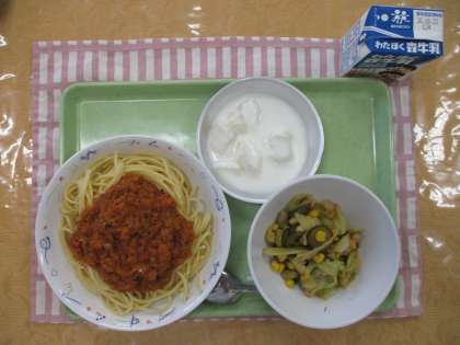 スパゲティミートソースは人気ベスト3に入る献立です。どの学年もよく食べていました。