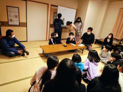 ナイトハイクは館内をまわります。ルールの話を聞いているときに、急に襖を開けた先生に驚かされました。まわる組み合わせ話は、くじ引きです。