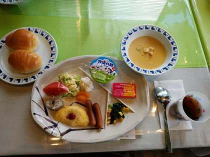 オムレツ、ウィンナー、シュウマイ、みかん、温キャベツ、トマト、ポテトサラダ、ほうれん草のコーン炒め、ヨーグルト、ジャム、マーガリン、ロールパン、コーンスープ