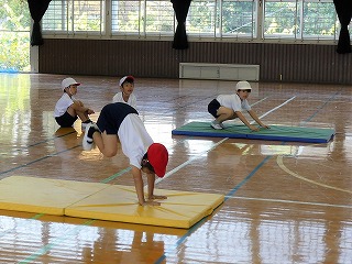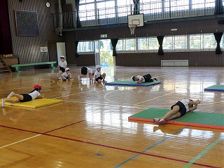 マットの上で背中や腹などをつけていろいろな方向へ転がったり、手や背中で支持したりして楽しむ運動遊びです。児童が日常生活では味わうことができない動きを身に付けていきます。