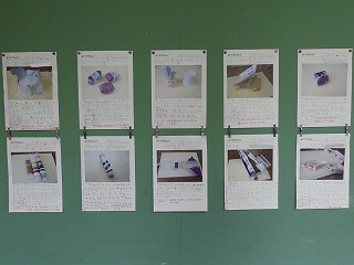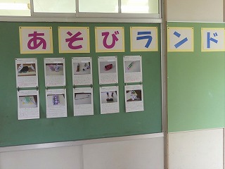 教室の廊下は、生活科のカードです。「うごく うごく わたしのおもちゃ」で作ったおもちゃについてまとめました。