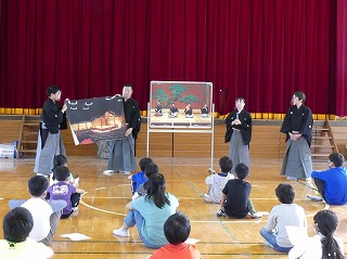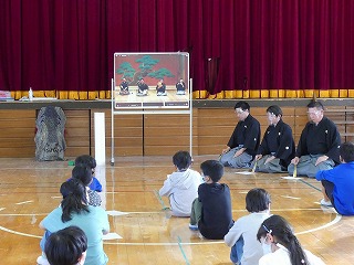 今年度、文化庁「文化芸術による子供育成事業」で大槻能楽堂「能」を鑑賞できることになりました。その鑑賞に先駆けてワークショップが行われ、4年生と5年生が参加しました。
