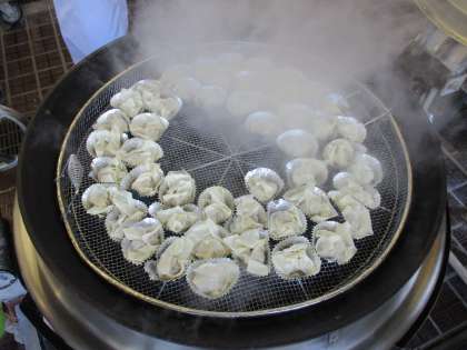 ミニしゅうまいはひとつひとつ手で包み、蒸し上げて作ります。大きな釜で蒸すので、一度にたくさんのしゅうまいを蒸すことができます。