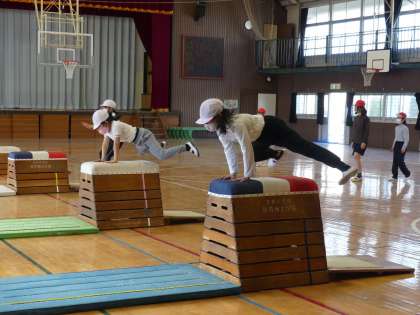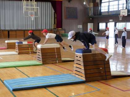 「開脚跳び」にチャレンジしています。ほとんどの子どもは軽やかに跳べるので、フォームや着地に意識しながら跳んでいます。