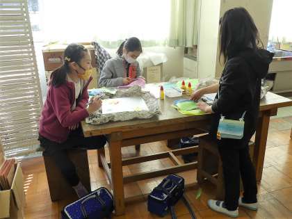 プラスチック段ボールにお花紙を貼り始めましたが、色セロハンも使いたいと担当の先生に頼んでいました。材料の組み合わせ方も考えているようです。