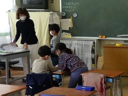 1年生の算数では、「時計の読み方」の学習に取り組みました。短針と長針の読み方を繰り返し練習していました。世の中の多くがデジタル時計となり、アナログ時計の読み方は子供たちにとって、難しく感じているようです。確かめの問題では、友達と教え合いながら学びました。ご家庭の中でも、「今、何時何分?」と言って、アナログ時計を読む習慣をお願いします。