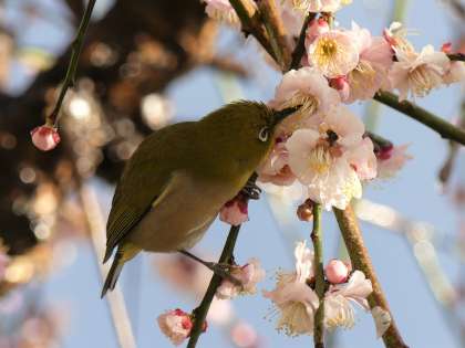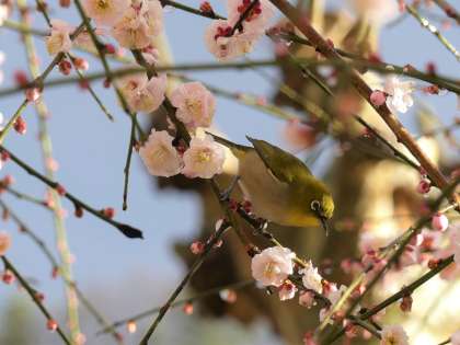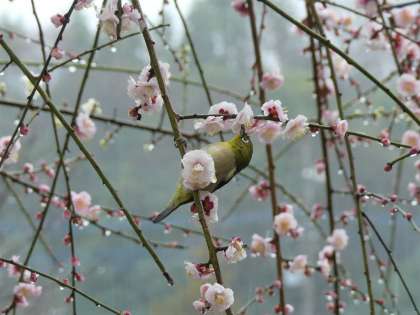 校長室前の紅白の梅が、良い香りで咲いています。メジロは、梅の花の蜜が大好きで、雨の中も来ていました。
