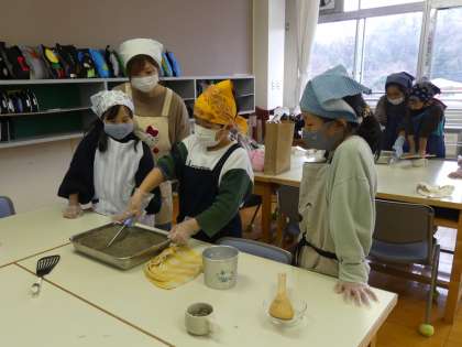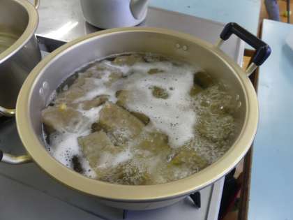 冷めたら、包丁で切って湯がきます。あくがたくさん出てきます。