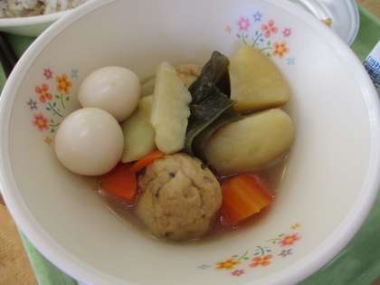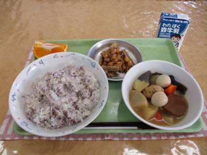 給食では絵本に登場したこんにゃくやがんもどき、つみれ、大根などが入ったおでんを食べました。