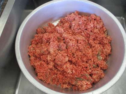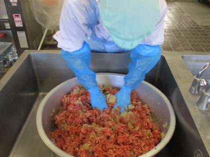 写真2枚目:みじん切りにして炒めたたまねぎ、つなぎの卵や牛乳、パン粉などを加えてよくこねています。