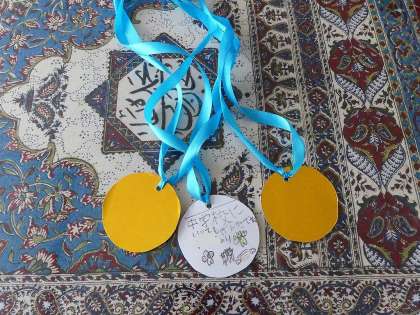 2年生はブンブンごま、1年生は金メダルです。6年生の何人かは、帰るまで金メダルをかけていました。
