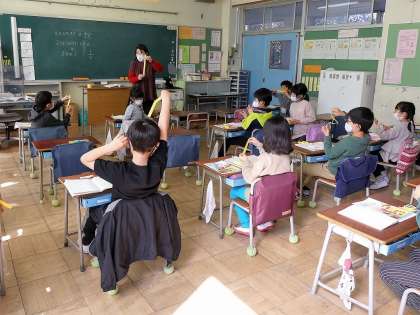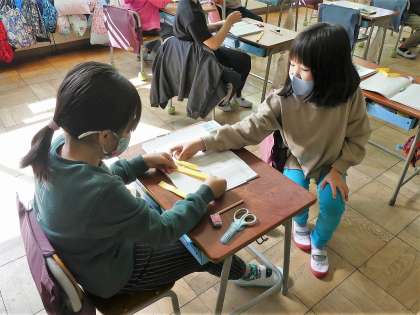テープを折って半分の大きさを作り、二分の一(1/2)という表し方の意味を理解します。もとのテープの長さが違うと、二分の一の長さも違ってきます。