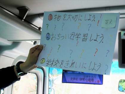 バスレクは、班ごとに考えたクイズです。「3月のことば朝会では全部で何人発表したでしょう」「3月の生活目標はなんでしょう」「保健室の植木鉢(お花)は、いくつあるでしょう」などの問題やなぞなぞがありました。