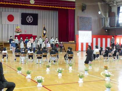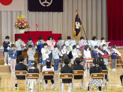 2年生による歓迎の出し物です。「きらきら星」の鍵盤ハーモニカ演奏と「にじ」の歌によびかけです。堂々と発表しました。