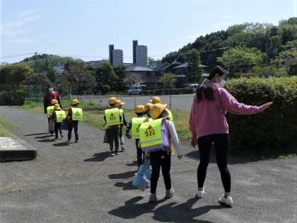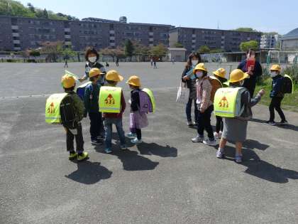 月曜日までは、方面別にグループになって、下校します。担任の先生だけでなく、専科など先生方も付き添っています。