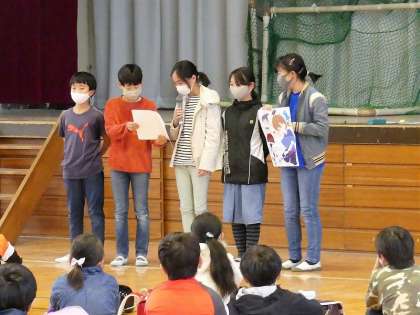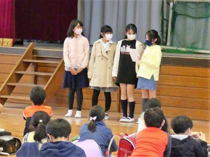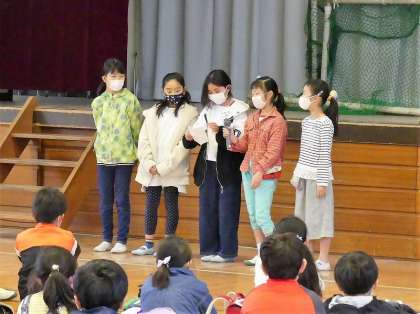 今年度、新たに作りたいクラブとして、「ボードゲームクラブ」「家庭科クラブ」「音楽(合奏)クラブ」があります。発案者の5・6年生が、みんなの前で、プレゼンをしました。