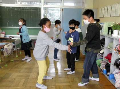じゃんけんゲームをしていました。じゃんけんに勝つと、相手のブロックを一つもらえます。最初2個しか持っていませんが、無くなったら、先生にまたもらえます。1回戦の最高の数は、8個でした。「すごーい」とみんなで拍手をして称えました。