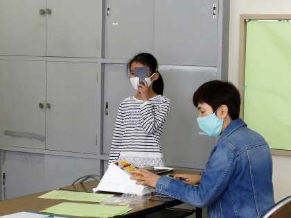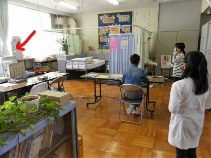 視力検査を行いました。ランドルト環と呼ばれる一か所が欠けた輪を提示して、検査します。近年学校では、現在の見え方の表示を視力のかわりにABCDの4つの記号で行うようになりました。これは従来の視力を4段階に区切ったもので、検査は視力0.3、0.7、1.0の3つの視標だけで行うことになったからです。
