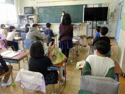 今日は、教室でみんなの意見を出し合ったあと、校庭に出て、春の植物を探しました。