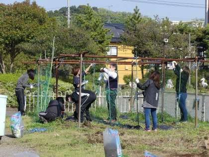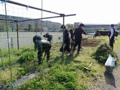 鹿島小では、さまざまな作物を栽培します。学年ごとに割り振られた畑があり、種まきや苗植えの準備を進めています。ミニトマト、ナス、ピーマン、ホウセンカ、ジャガイモ、ヘチマ、ヒョウタン、キャベツ、ヒマワリ…。それらは、生活科や理科の学習で扱う植物であり、収穫を目指して育てる植物でもあります。4月始めには、先生方で作業しました。