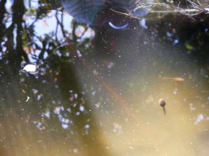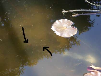 2年生の「春を探そう」で池にいたのは、矢印のところをよーく見てください。オタマジャクシでした。どんなカエルになるのかな。