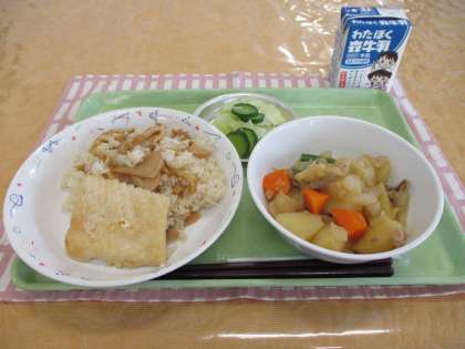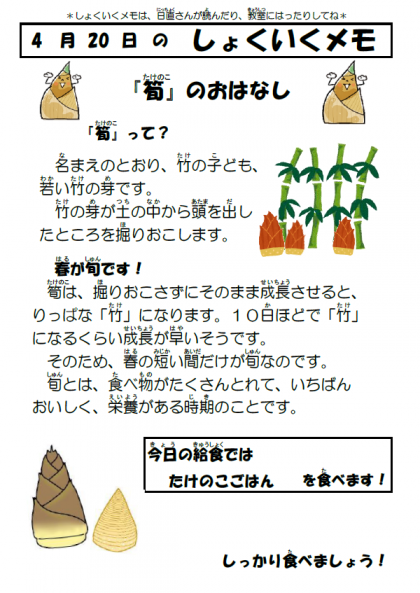 今日は今が旬のたけのこを使ったたけのこごはんでした。