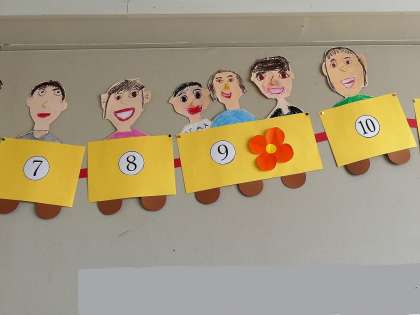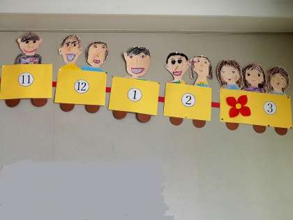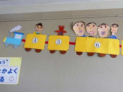 図画工作の時間に描いた自分の姿が誕生日ごとに、列車に乗っています。みんな楽しそうですね。