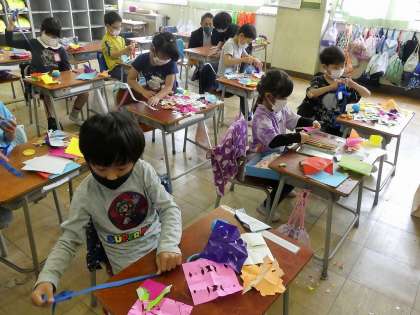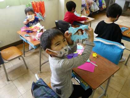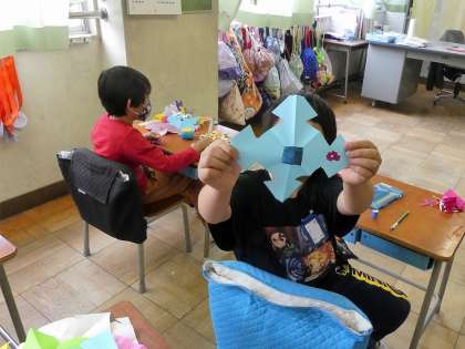 紙を折ったり、重ねたりして切って開くと、面白い形になります。「できたよー」とうれしそうです。