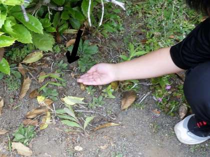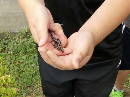「トカゲだ!」と子供たちが集まっていました。見せてもらうと、尾が虹色でとてもきれいです。「なかなか貴重なトカゲですよ」と教えてもらいました。ニホントカゲの幼体(こども)でしょうか。すぐに逃がしてあげました。