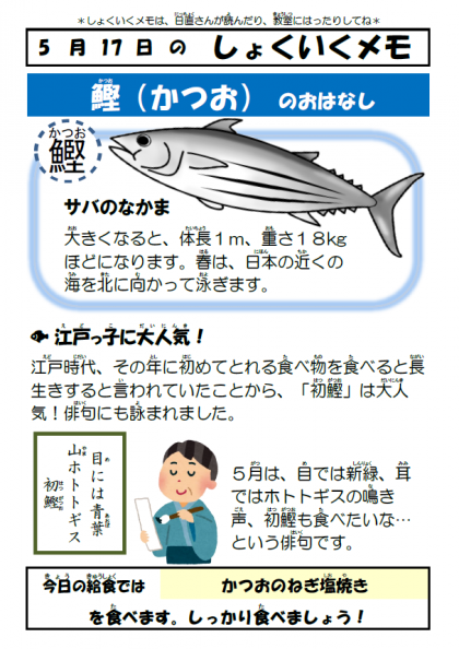 今日は春が旬の「かつお」を食べました。給食の放送ではかつおには旬が2回あることや、それぞれの旬のかつおの違いについて説明しました。