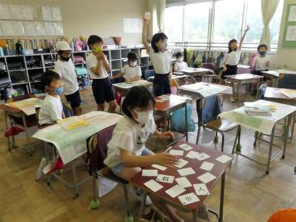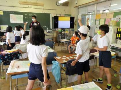 わたしたちのまち(八王子市)について学習しています。その関連学習で、地図記号についても勉強しました。クイズ形式で、知識の定着を図ります。