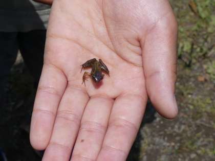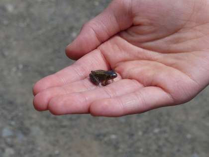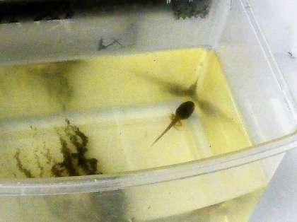 オタマジャクシはたくさんいましたが、カエルの姿はなかなか見つけられませんでした。校庭で理科の授業をしていた4年生が、「いますよ」と教えてくれました。オタマジャクシが大きかったので、カエルの大きさも「このくらいかな」と想像していました。思ったより小さいカエルでした。なぜでしょうか。