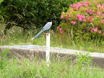 黒い帽子をかぶっているようで、翼は短かく幅広、尾は長い鳥です。黒とブルーグレイの姿をひらひらさせて水平に飛ぶ様子は、素敵ですが、実は、カラスの仲間だそうです。やっと写真を撮りましたが、向こうむきなので、またチャレンジします。