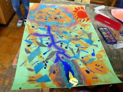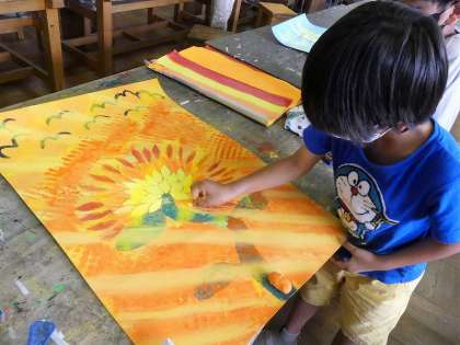 花の近くの雰囲気をパステルで描きながら、こすってぼかしたり、消しゴムで消したりしながら仕上げていきました。とても集中して描いている子供が多く、自分だけのまぼろしの花の世界に浸っているようでした。