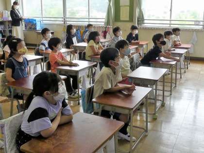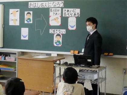 栄養教諭実習生の研究授業の様子です。お箸の持ち方を学習し、「おはし名人」を目指します。