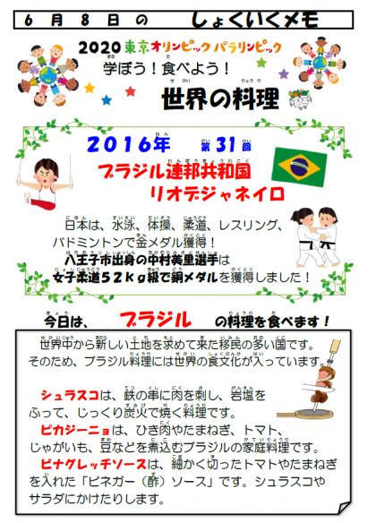 八王子市の小学校では東京オリンピック・パラリンピック開催までの間、これまで夏季オリンピックが開催された都市・国の料理を毎月1回給食で食べる取組をしています。