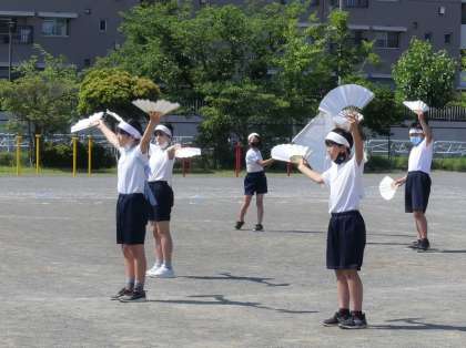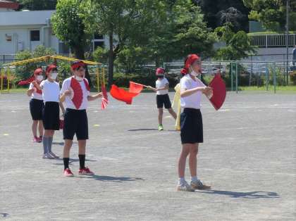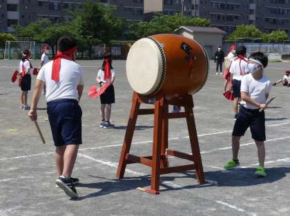 応援の太鼓係の合図で入場し、応援歌、応援、エール交換をします。