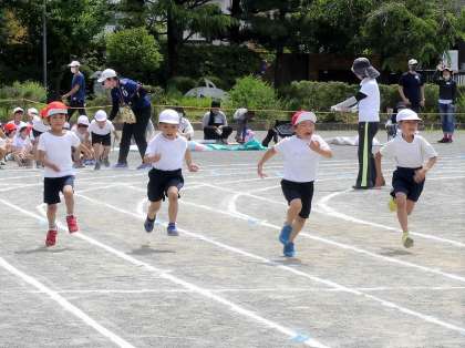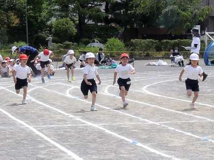徒競走は、レースごとに呼名されてから走ります。ゴールに向かって、まっすぐ、まっすぐ。