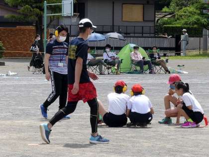 会場の児童の様子を見守ったり、用具の準備をしたり、進行、放送、救護、得点、受付、ビデオなどたくさんの仕事をこなしています。