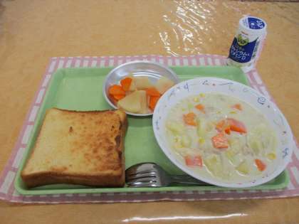 今日は八王子産のキャベツをたっぷり使ったクリーム煮です。八王子には地場産の野菜がたくさんあるので、給食では旬の地場産の野菜を使うように心がけています。