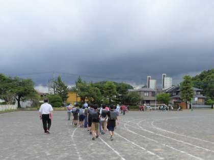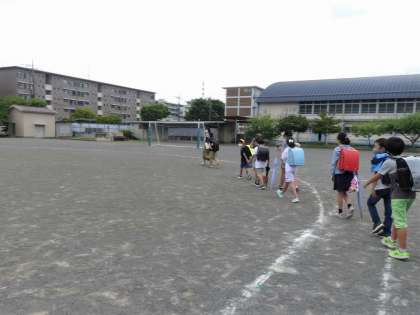 「近隣で不審者の情報がある」、「これから台風が近づいてくる」などの災害発生時に、集団下校を行うことがあります。鹿島小では、10の地区班に分かれ、6年生が子供たちを並ばせます。本日、今年度初めての訓練でしたが、先生方の指示をしっかり聞いて静かに下校しました。