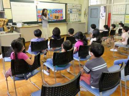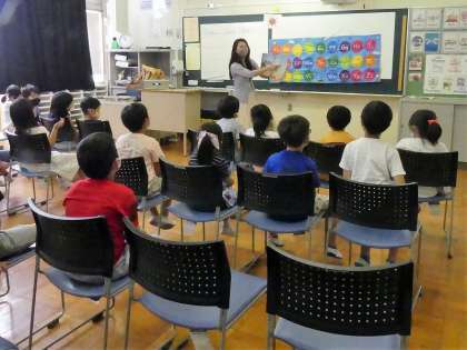 始めてイングリッシュルームで外国語(英語)の学習をしました。英語の絵本の読み聞かせで盛り上がりました。