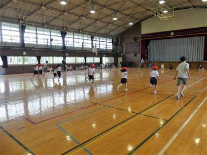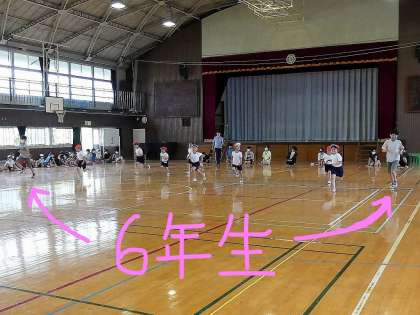 1年生もシャトルランに取り組みました。はじめに飛ばしすぎるとばててしまうので、6年生が両側でリードしてくれました。記録も6年生がつけています。6年生の励ましもあって、とてもよい記録が出ました。