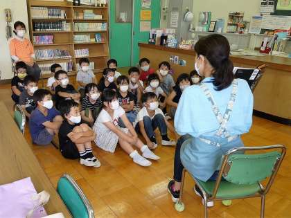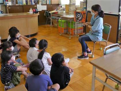 今日は、学期に1回の「図書&給食コラボ」がありました。学校司書の先生が、各学年に「やきざかなののろい」という本の読み聞かせを行い、その後、栄養士が本の内容にある魚について話をしました。