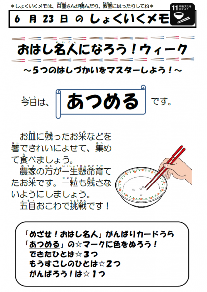 今週は「おはし名人になろう!ウィーク」です。箸を上手に使って、はさむ・つまむ・あつめる・きりさく・骨をとるの5つの箸使いを給食中に取り組みます。