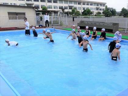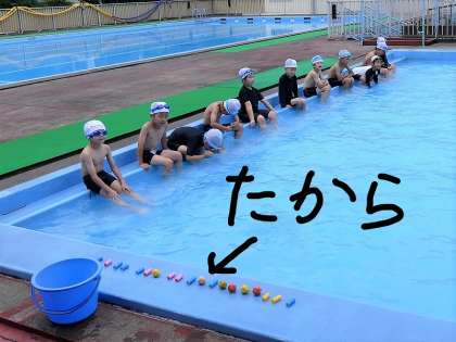 2年生も、2回目の水遊びです。水慣れをしたあと、宝ひろいをして楽しみました。