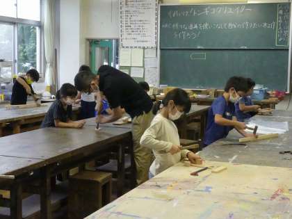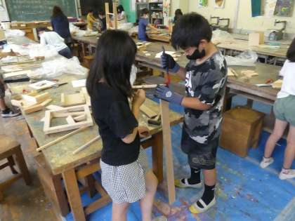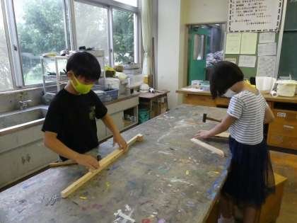 のこぎりで木材を切り、かなづちを使ってくぎを打って、つくりたいものをつくっています。道具を使うことの楽しさと難しさ、形を組み合わせる面白さを体得しています。